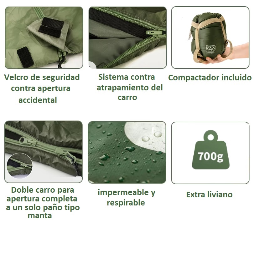 5. Bolsa de compresión: permite que el saco de dormir se comprima al tamaño mínimo, sea liviano, compacto y portátil.