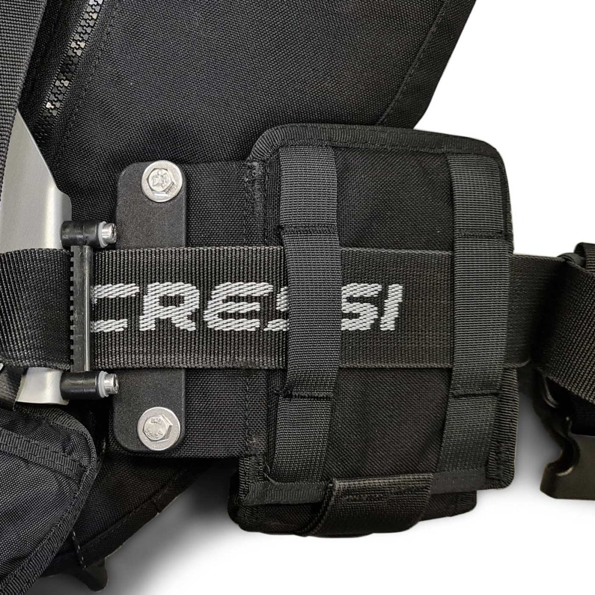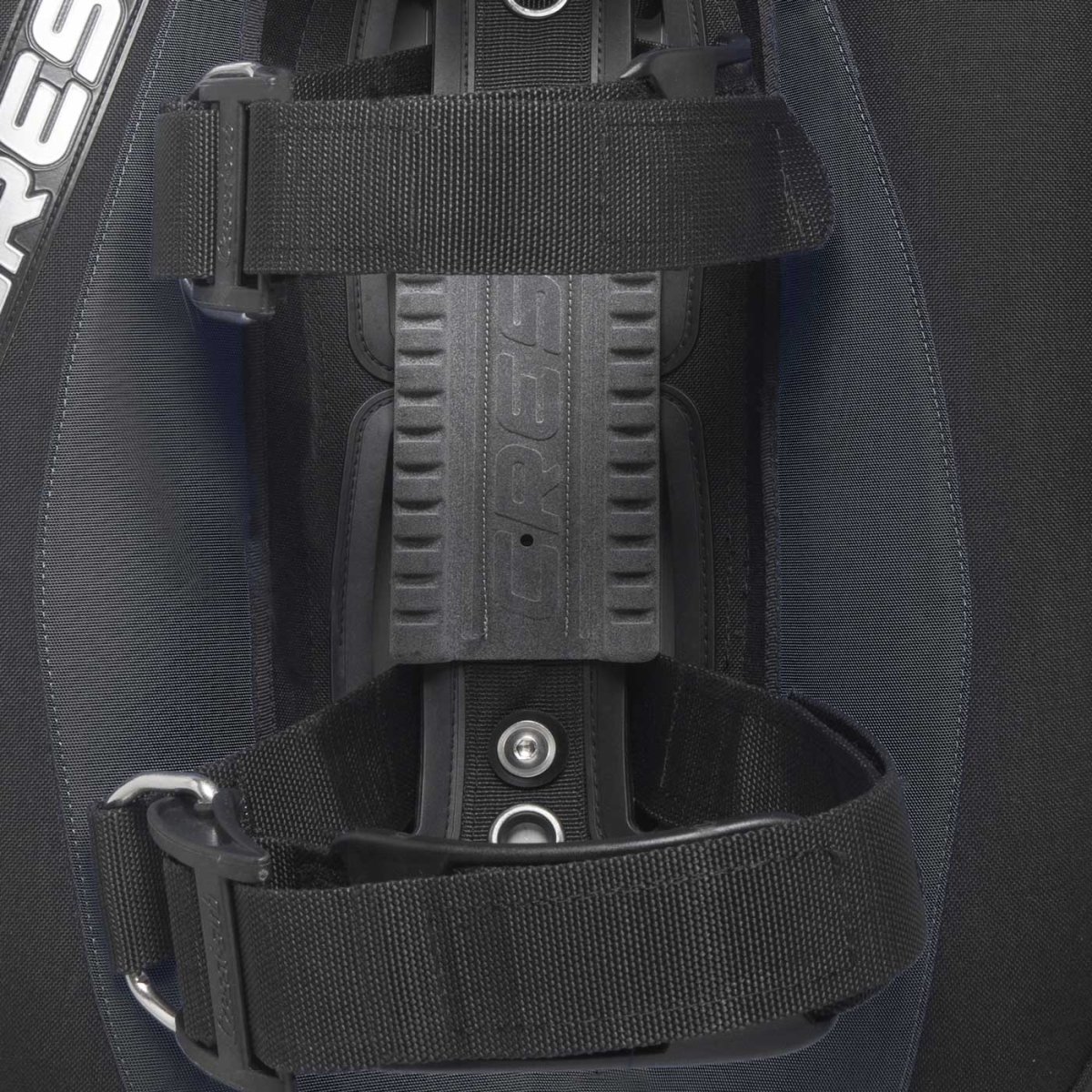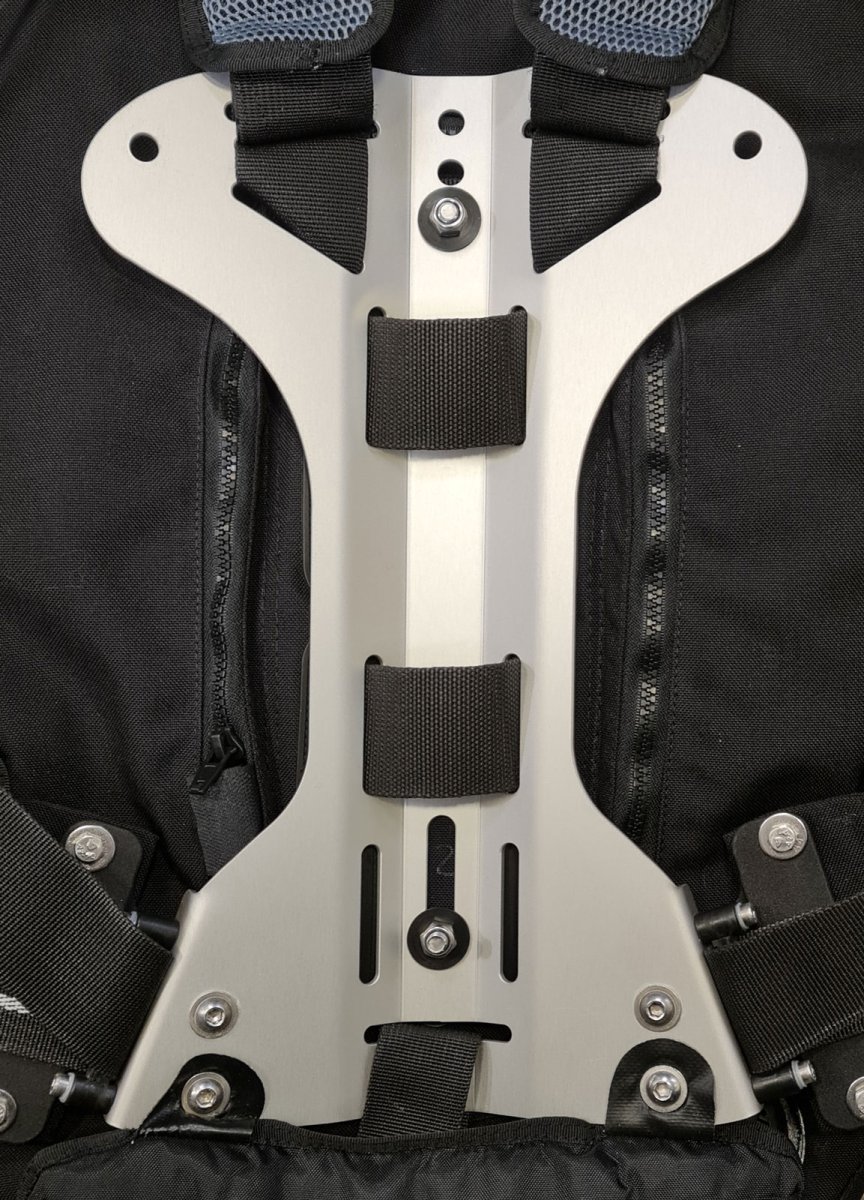 - Sistema portalastre integrado, ensamblado directamente en la placa con el fin de garantizar la fijación de este tanto para mantener la estabilidad durante el buceo como para no perjudicar la tarea de gestión de los bolsillos de lastre.