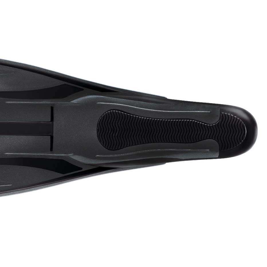 - Diseño «calzante bajo la pala»: la pala nace directamente de la parte superior del calzante, uniendo sólidamente la aleta al pie y transmitiendo todo el esfuerzo generado al aletear, sin pérdidas de energía a través de zonas blandas. Este formato permite canalizar el agua desde el mismo tobillo hasta el borde final de la pala, a diferencia de los modelos tradicionales, en los que el calzante no tiene aportación alguna sobre el avance. Aparte de mejorar la direccionalidad del aleteo, este diseño proporciona unas prestaciones entre un 10% y un 15% superiores a las que corresponderían a la aleta por su superficie de pala.