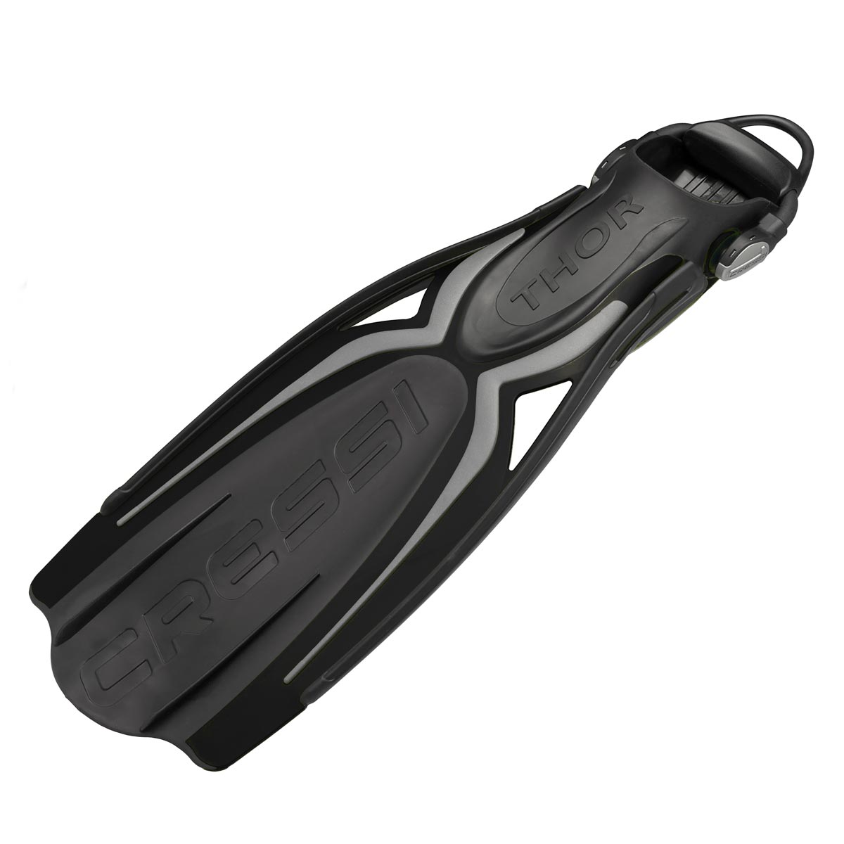 Thor disfrurta del exclusivo sistema de inyección de 3 materiales patentado por Cressi, que proporciona una excelente combinación de resistencia, potencia, confort y estética y la optimización de los requerimientos de cada zona de la aleta: