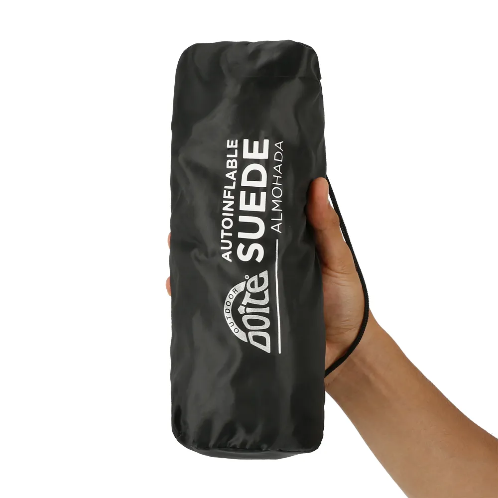 Almohada auto inflable de tacto suave y válvula de inflado. Cómoda y práctica para noches de camping y experiencias al aire libre.