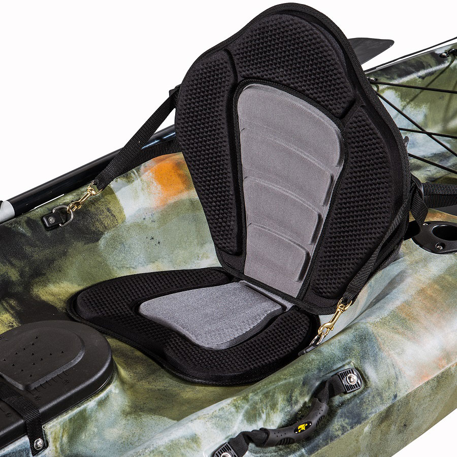 Este asiento para kayak es tipo completo con base abajo y respaldar alto. Incluye refuerzos especiales acolchados y puntos de refuerzo para soportar la presión de la espalda. Además está fabricado en material resistente al agua y probado en condiciones de uso frecuente en el mar. Es la mejor opción en asientos para kayaks tipo sit-on-top o auto-vaciable (antes de pasar a un asiento tipo silla o butaca con marco de aluminio).
