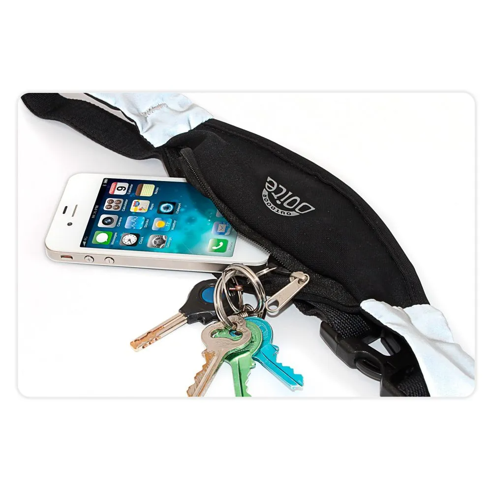 Banano multisport posee bandas elásticas ideales para realizar deporte. Tiene un espacio reducido, práctico y dos sectores con reflectante de seguridad. Posee solamente un bolsillo con cierre.