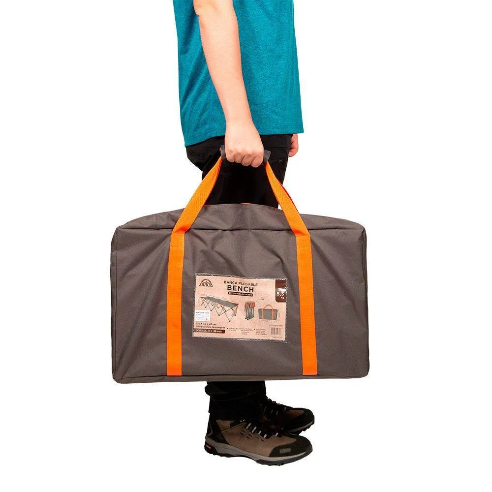 BANCO PARA 4 PERSONAS. Sumérgete en la comodidad y practicidad con nuestro Banco para 4 Personas, un complemento esencial para tus aventuras al aire libre. Con una estructura de acero robusta y tela de poliéster duradero con revestimiento de PVC, este banco ofrece resistencia y confort. Sus dimensiones generosas de 175x45x43 cm proporcionan espacio para cuatro personas, creando un ambiente acogedor en cualquier entorno. A pesar de su capacidad para soportar hasta 70 kg por asiento (total 280 kg), su peso ligero de 5,3 kg lo hace fácil de transportar. El bolso de transporte incluido, con medidas de 60x15x35 cm, facilita llevar este banco a cualquier lugar. Ya sea en un campamento, una reunión al aire libre o simplemente disfrutando de la naturaleza, este banco se convierte en el punto de encuentro perfecto. Convierte tus momentos al aire libre en experiencias inolvidables con BENCH. Combina durabilidad con diseño funcional y descubre cómo este complemento transforma tus escapadas en momentos compartidos llenos de confort y conexión.