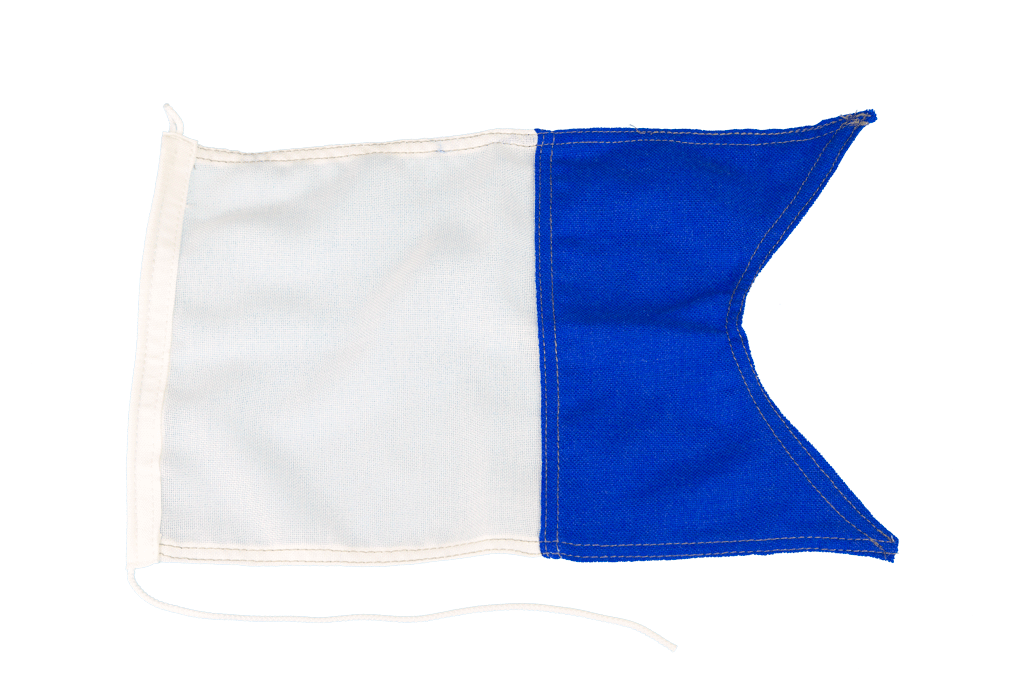 La bandera «Alfa» de color azul y blanco que corresponde a la letra «A» del código internacional de señales.
