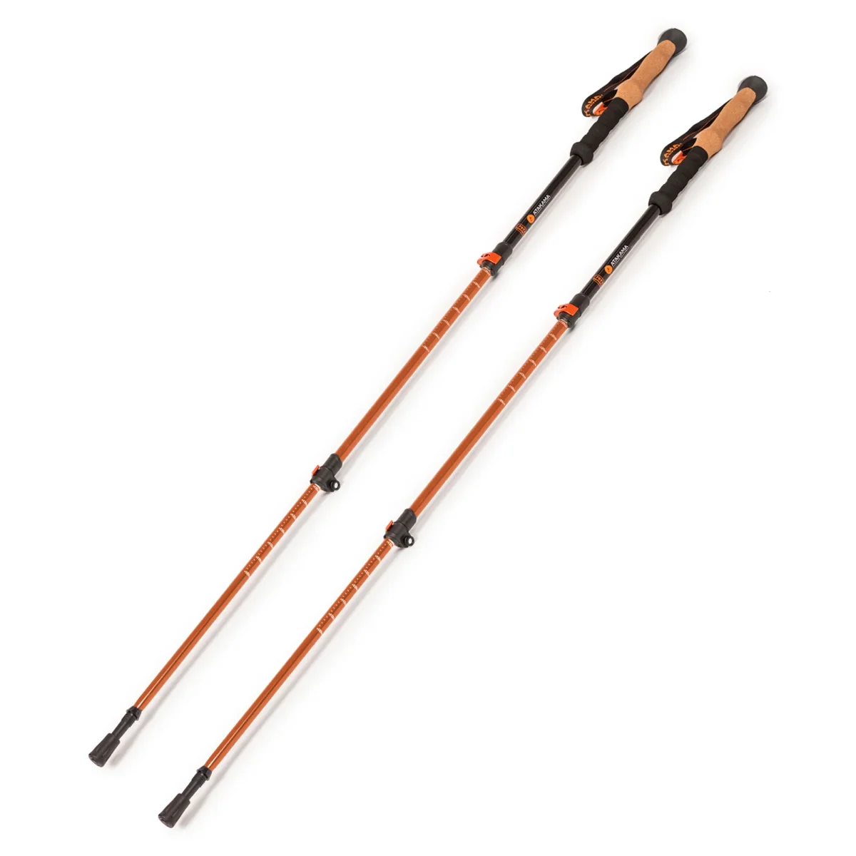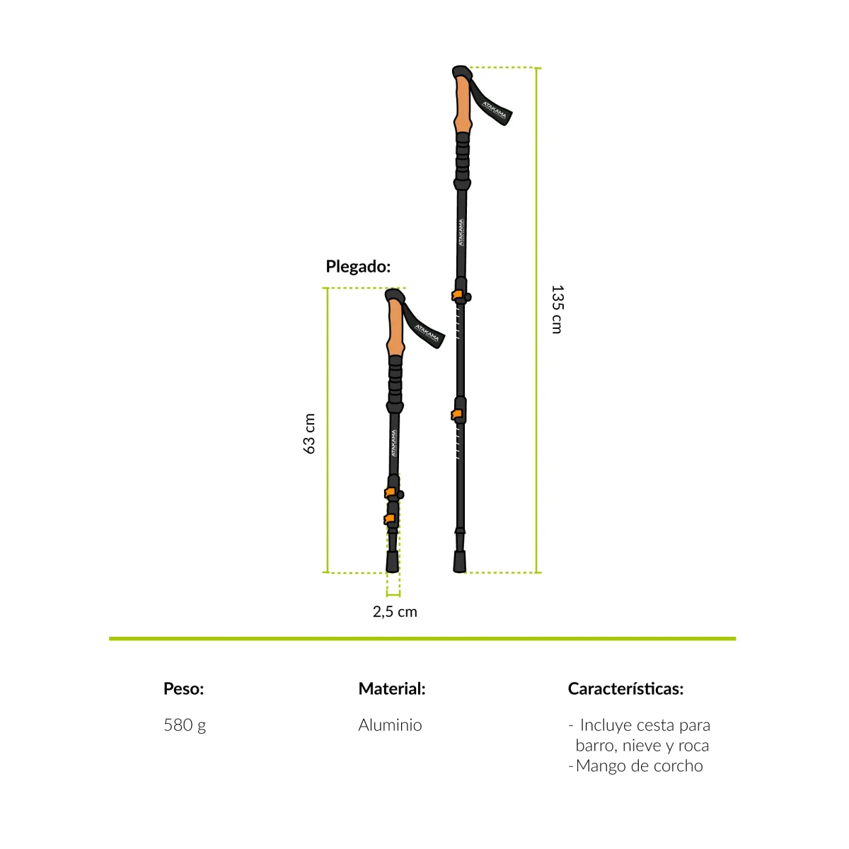 Bastones de Trekking Queulat, distribuyen el peso del cuerpo para reducir la carga en piernas y articulaciones. Hechos de aluminio 7075, cuentan con mango de corcho, empuñadura de espuma y bloqueo rápido, ideales para terrenos exigentes.