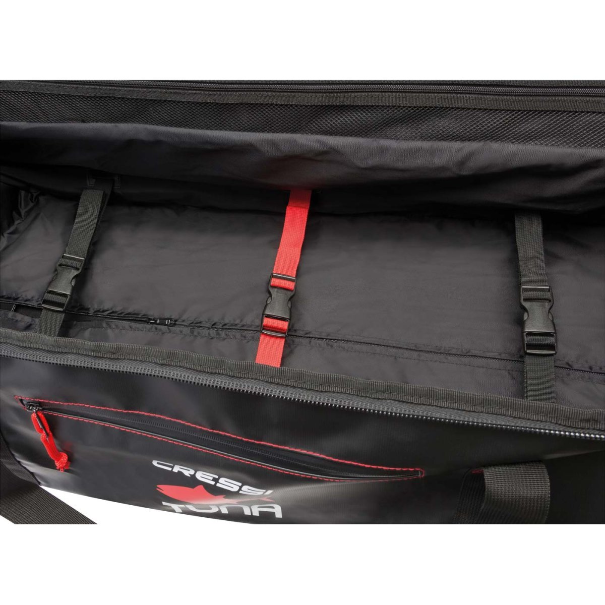 Su tamaño (95 x 40 x 35 cm) y un volumen total de 120 l es idóneo para un equipo completo añadiendo, incluso, las más largas aletas de buceo o apnea.
