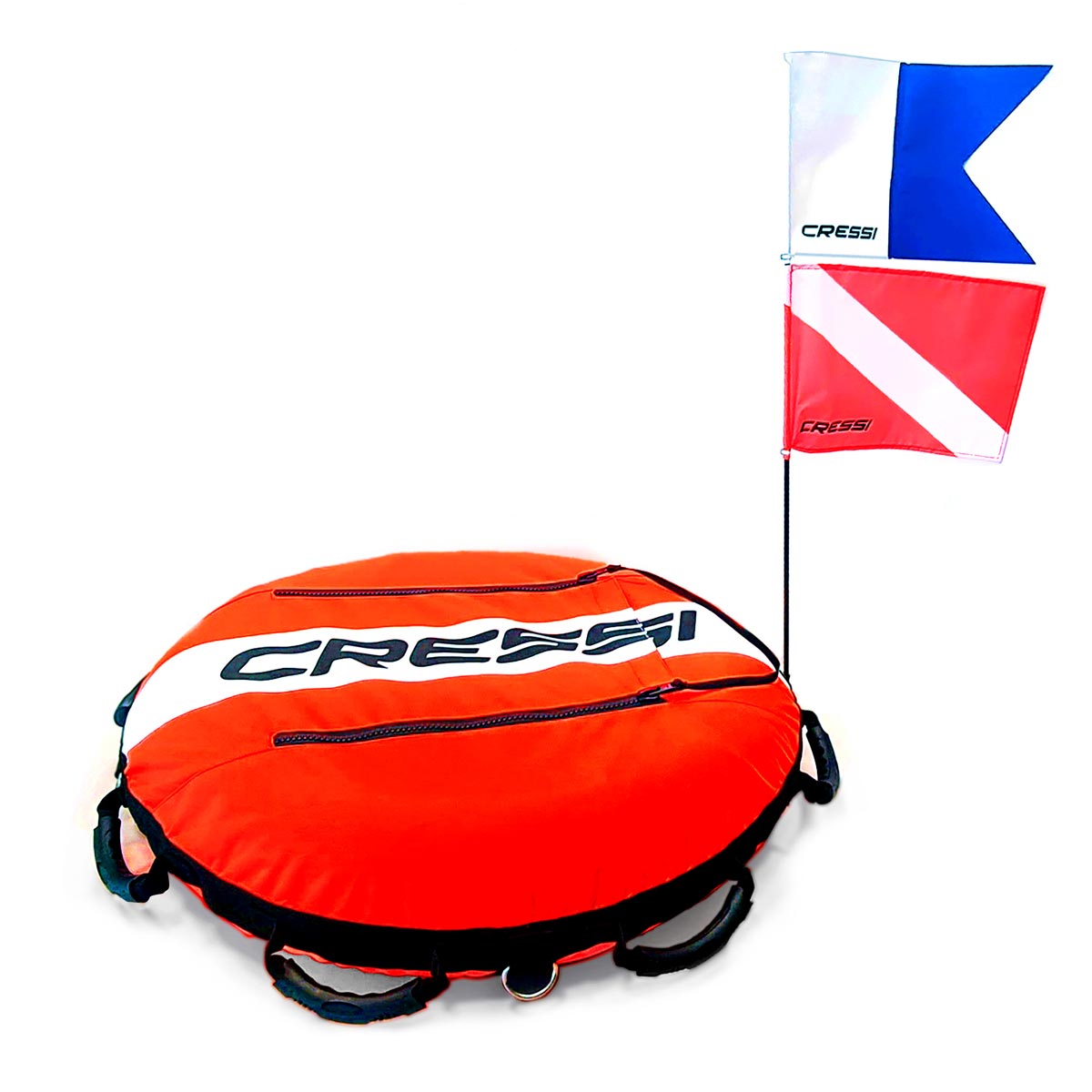 Mástil con doble pabellón: Alfa – buceador bajo el agua (código internacional) y bandera de buceo (americano) de alta visibilidad y anclaje seguro y que garantiza su verticalidad.