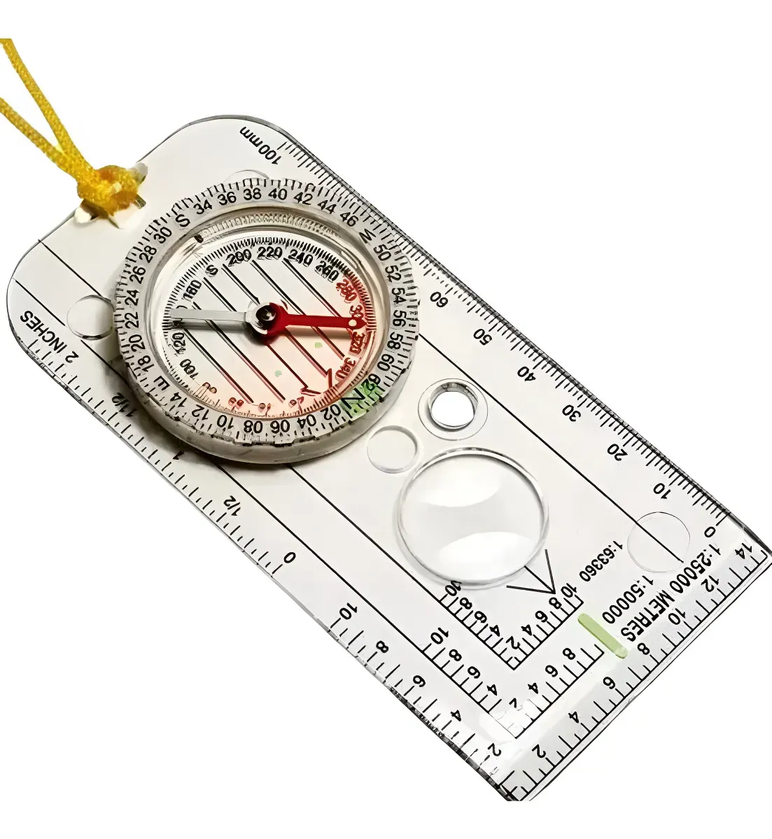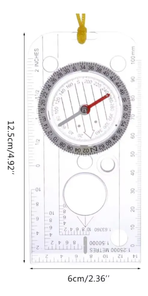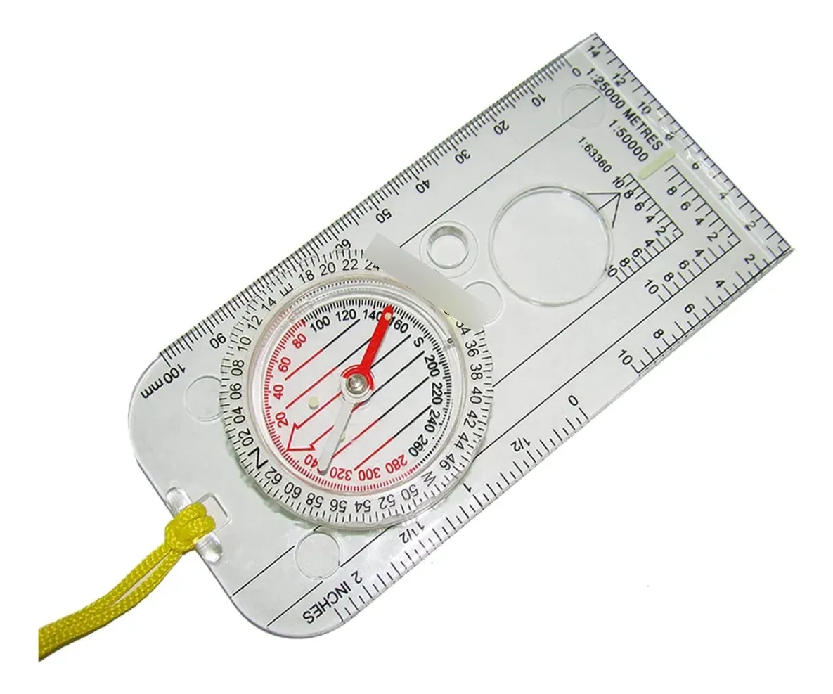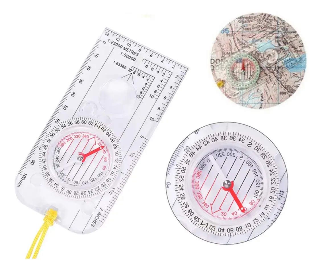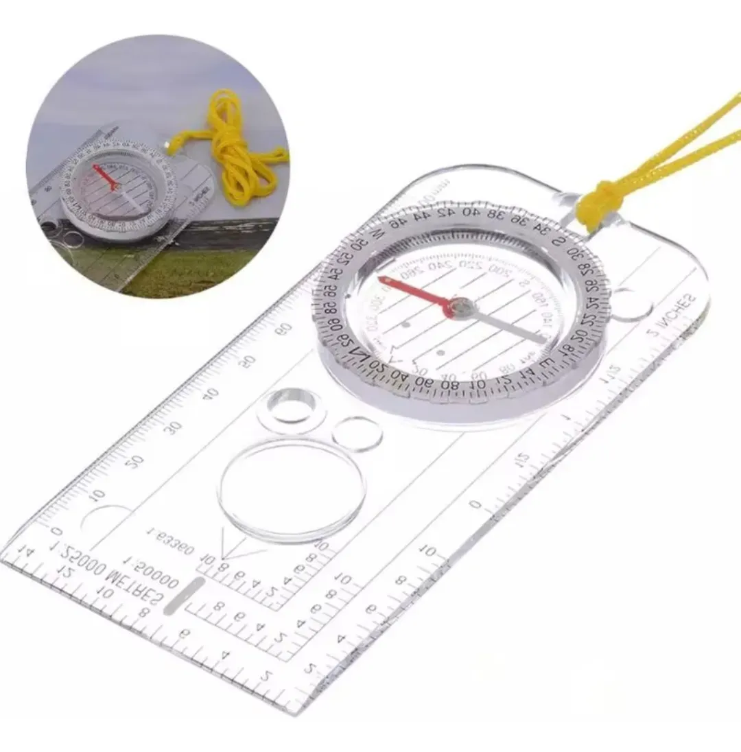 Regla de orientación con brújula integrada, ideal para navegación en exteriores. Diseñada para facilitar la lectura y el cálculo de distancias en mapas, es una herramienta esencial para actividades como camping, senderismo, exploración y excursiones al aire libre.
