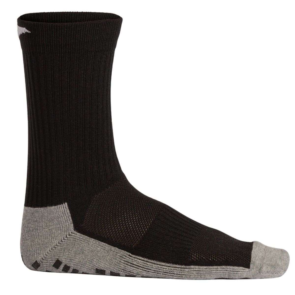 Calcetin Joma Antideslizante Negro Gris Incluye refuerzo en el talón para aportar mayor resistencia, costuras planas para evitar rozaduras y proporcionar el máximo confort y el tejido está tratado para que no proliferen bacterias debido al sudor.