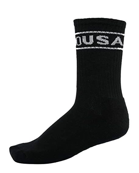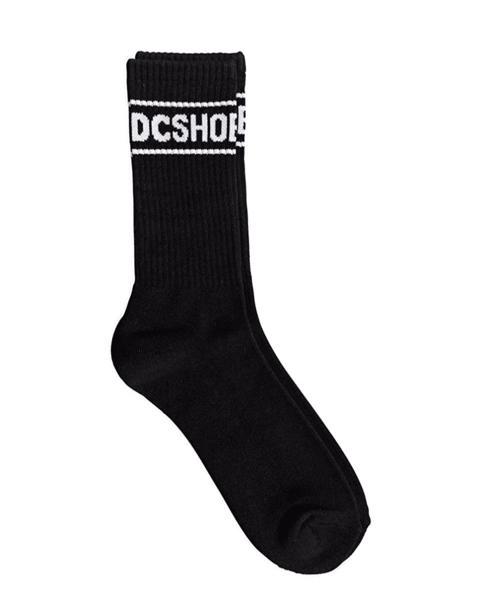 Calcetines largos DC negros de tejido elástico mezcla algodón poliéster de alto gramaje, raya y logo DC y longitud hasta media pantorrilla.