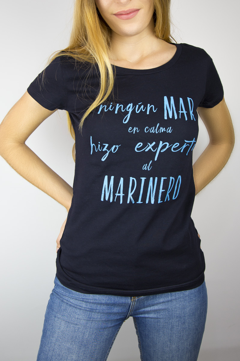 Camiseta de algodón mujer «Ningún mar en calma hizo experto al marinero» de color azul marino.
