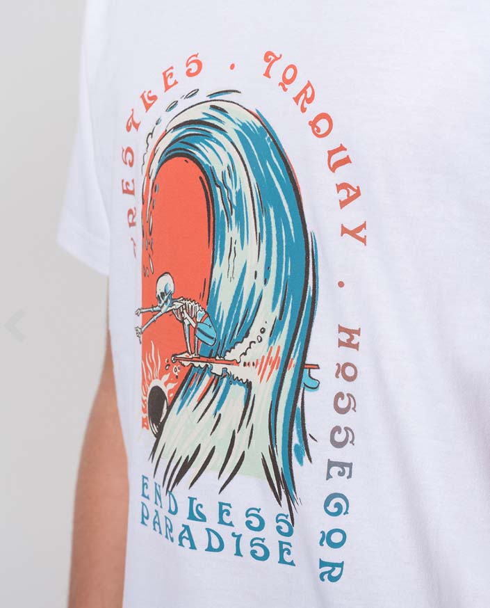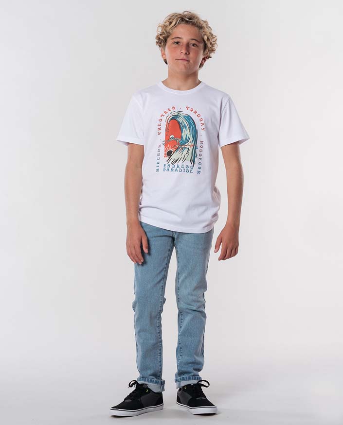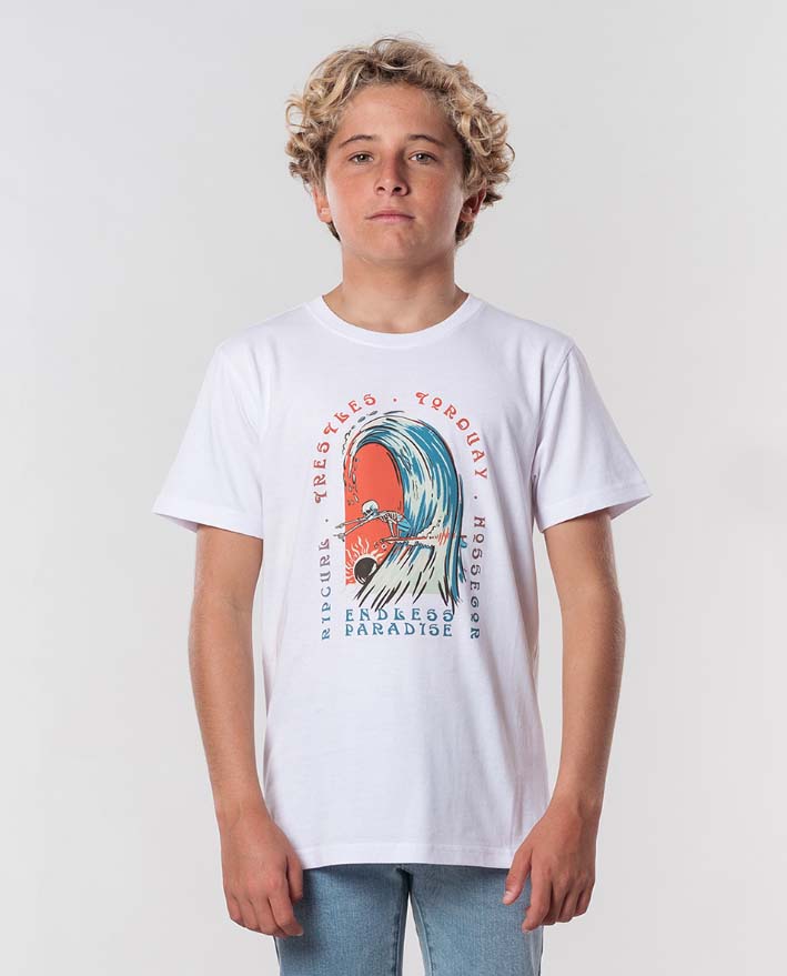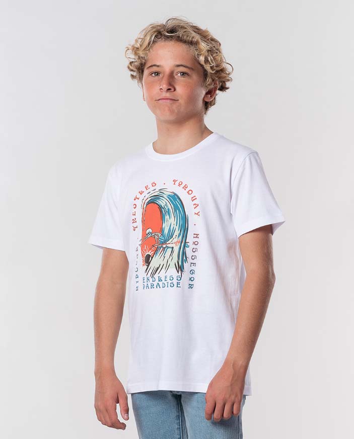 La Endless Paradise es una camiseta de manga corta para niño que luce un precioso diseño surfero de aires góticos.