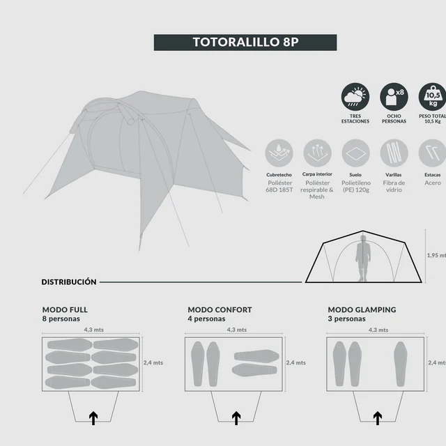 – Espacio para dormir: 430 x 240 x 195 cm