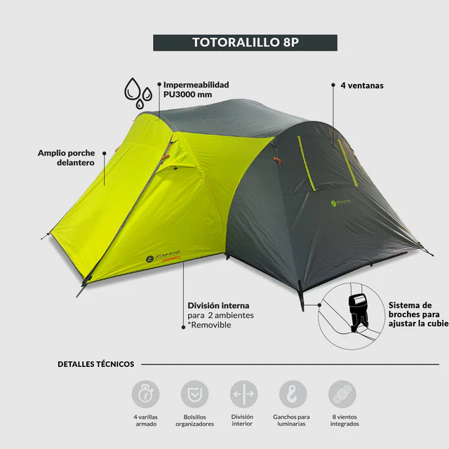 Si buscas comodidad y espacio para disfrutar de una experiencia de camping inolvidable con tu pareja, familia o amigos, esta carpa es la opción ideal. Diseñada para ofrecer amplitud, funcionalidad y resistencia, será tu refugio perfecto en cada aventura al aire libre.
