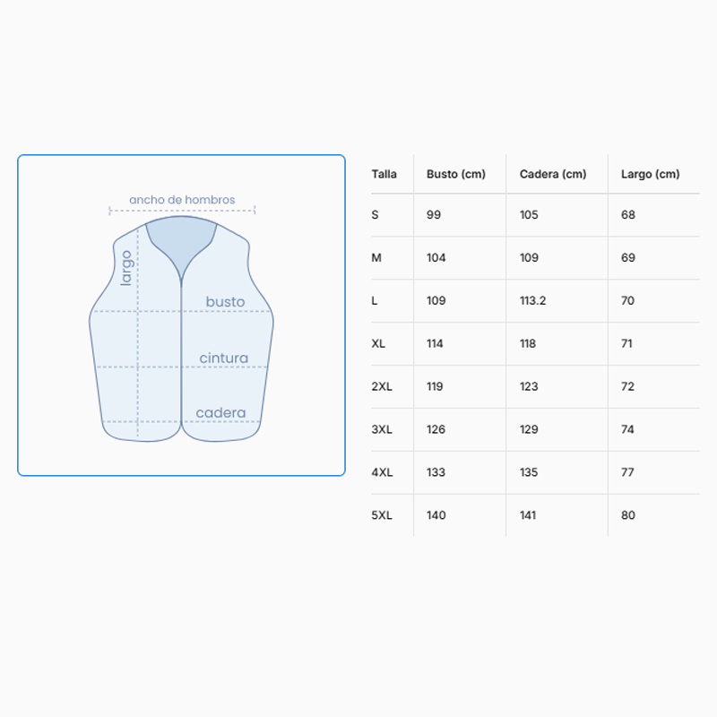 | Talla | Busto (cm) | Cadera (cm) | Largo (cm) |