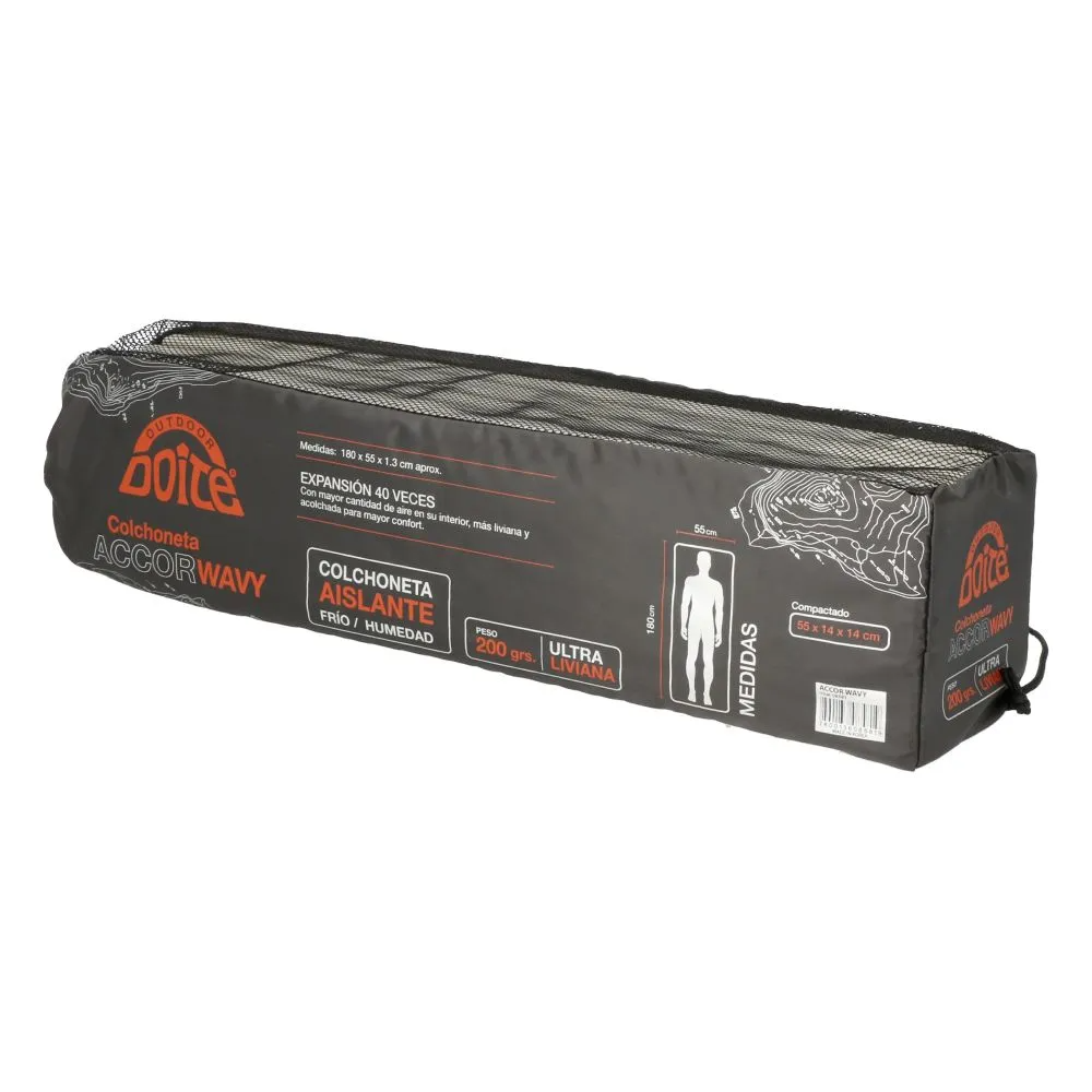 Colchoneta tipo acordeón, liviana (250 grs.) y fácil de transportar, sirve como aislante del frío y la humedad del suelo. Tiene una expansión de 40 veces.