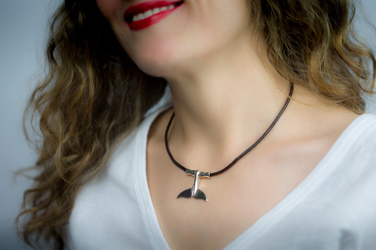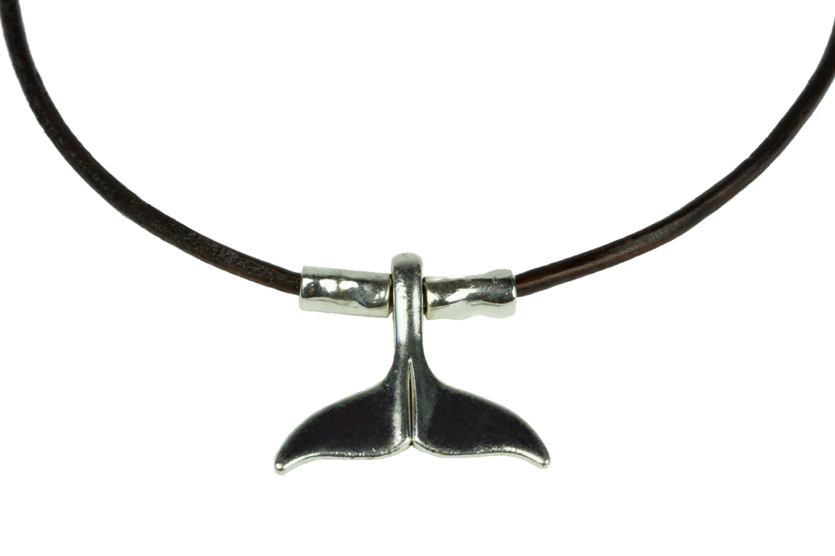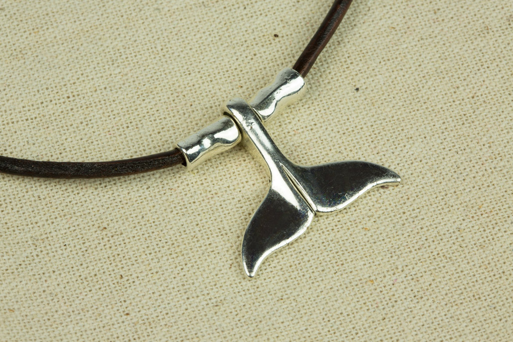 Collar cola de ballena artesanal hecha con cuero y zamak.