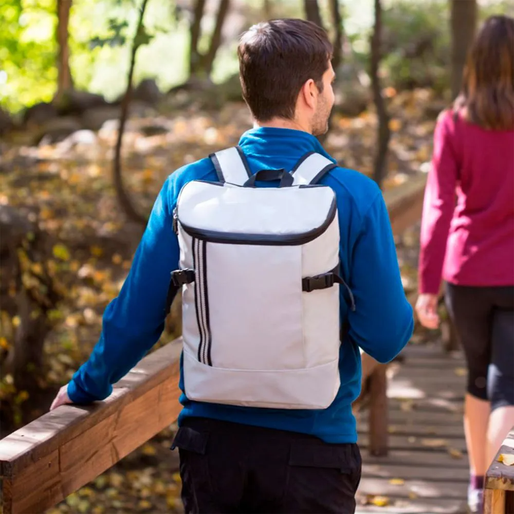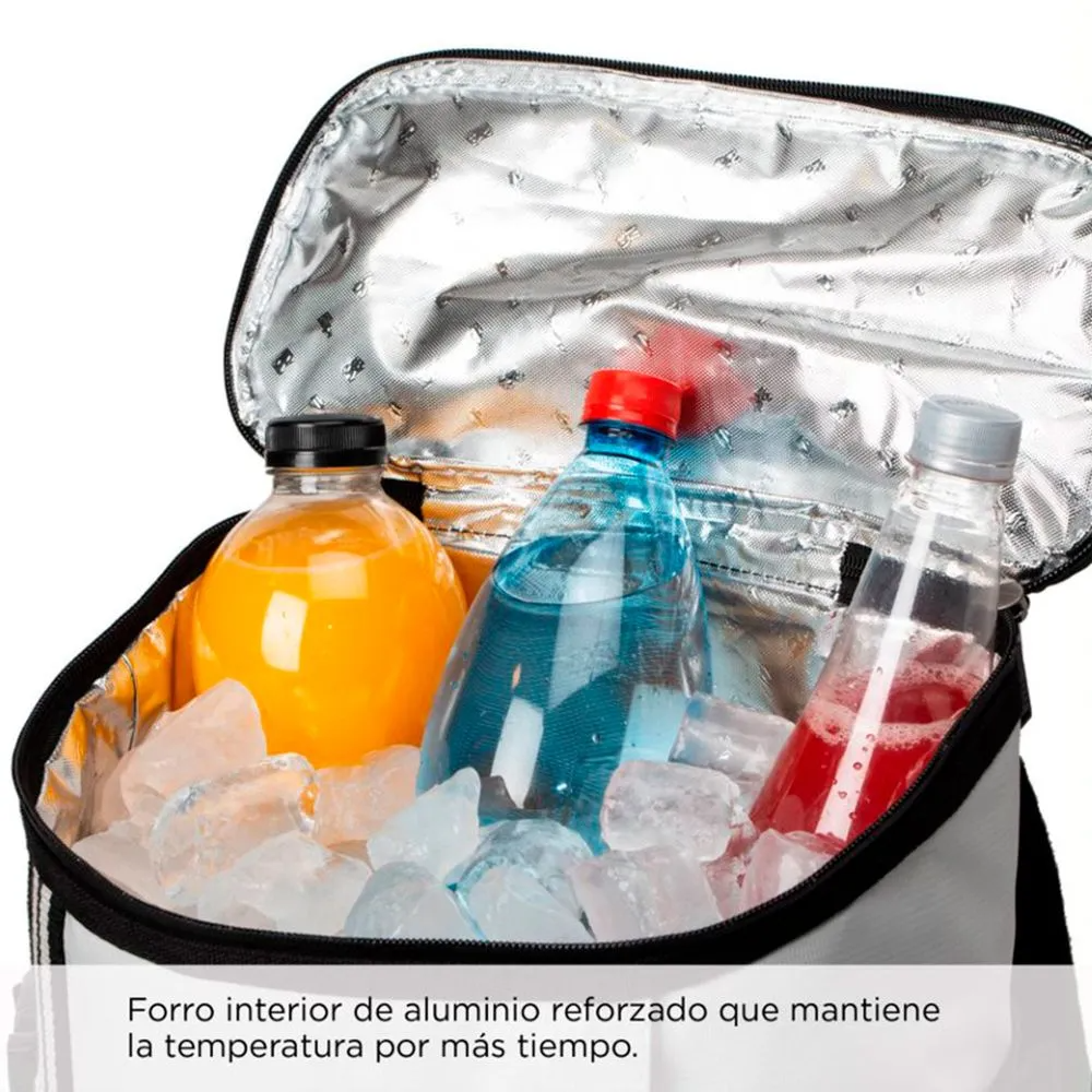Cooler en formato mochila con capacidad interior de 16 litros. Su material exterior es resistente y fácil de limpiar, y gracias a su interior de aluminio reforzado conserva la temperatura.