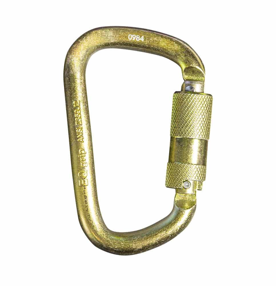 Mosquetón de acero de 45KN con cierre automático de dos pasos y una superficie rugosa para facilitar la apertura. Forma en D muy útil en varias aplicaciones de trabajo en altura, seguridad industrial, rescate, descensos y deportes de aventura.