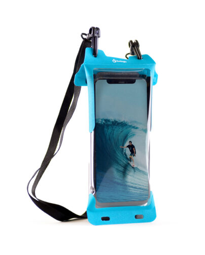 Funda Estanca Movil Surflogic, medidas 107 x 230 mm, peso individual 0,06 kg, ventana de pantalla táctil transparente, cierre estanco de alta densidad, cordón ajustable y extraíble para el cuello, soporte para Face ID, ventana transparente delantera y trasera para fotos y vídeos, ideal para proteger su smartphone mientras practica deportes acuáticos.