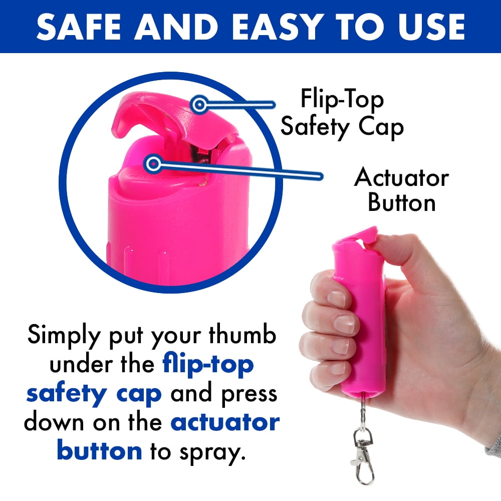 Solo toma una fracción de segundo. Primero, gire el aplicador para desbloquear la unidad, esto impide lanzamientos involuntarios, luego apunte hacia el atacante a la cara, de preferencia a los ojos. Un potente chorro de proteccion saldra a una distancia de hasta 4 metros, inhabilitando al atacante por mas menos 10 minutos.