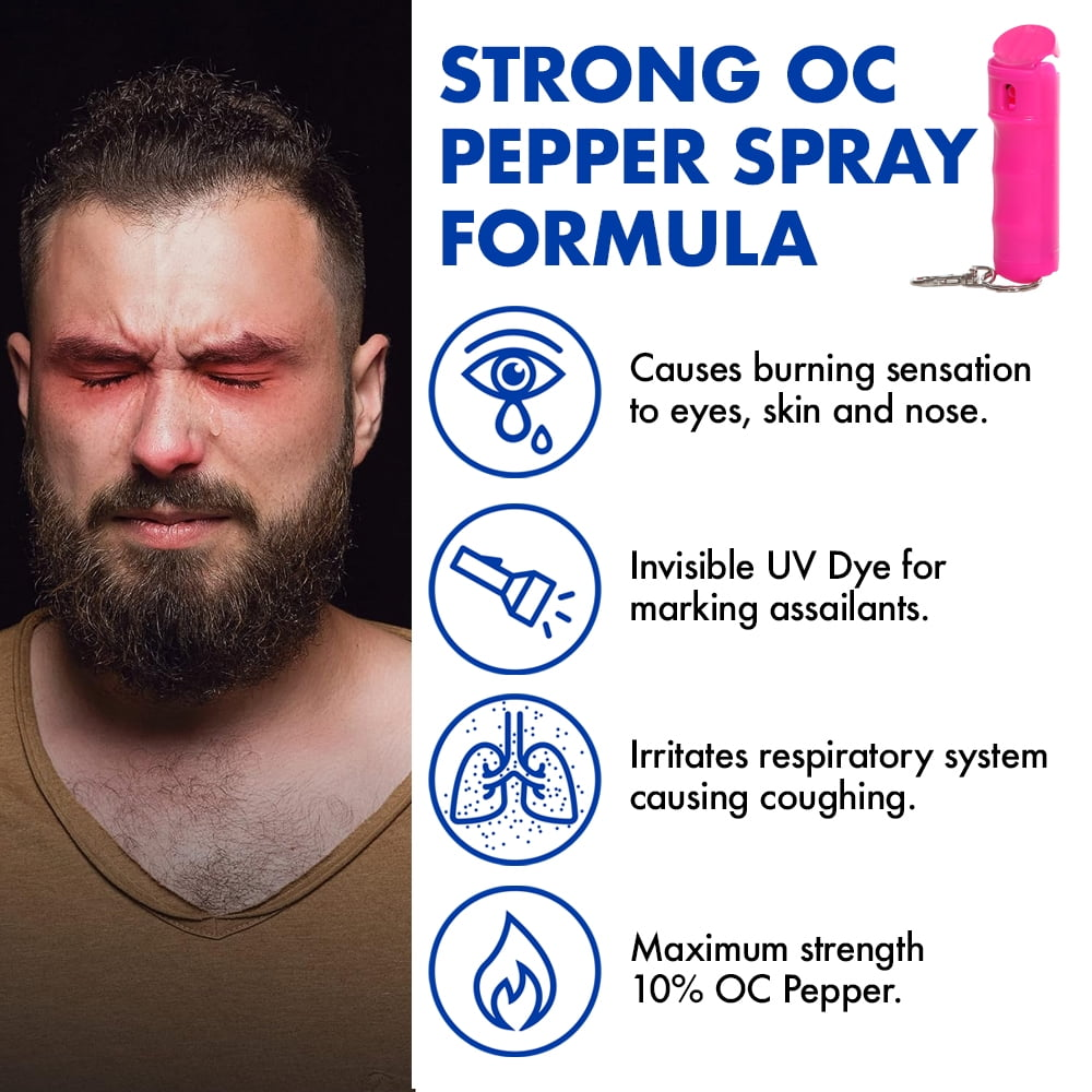 Un rocío a la cara del atacante es suficiente para detenerlo al instante y evitar que continúe agrediendo. Los síntomas desaparecen después de una hora, también es efectivo contra animales.