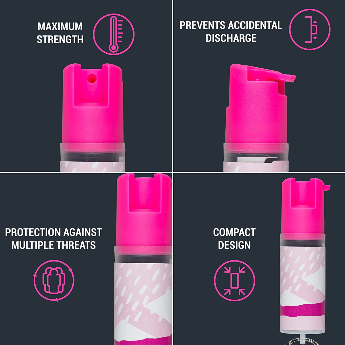 - Fácil acceso: el llavero hace que este spray de pimienta sea fácil de transportar; asegúralo en las llaves, colócalo a un cordón o guárdalo en una bolsa para protección todos los días. La seguridad de bloqueo giratorio ayuda a prevenir descargas accidentales mientras estás en un bolso o cuelga de las llaves