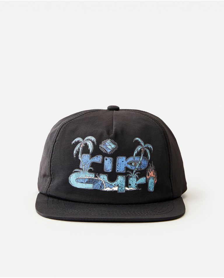Gorra Rip Curl Surf Cosmic Barrel Junior, 100% poliamida, visera plana, serigarfia con logo y diseño de la marca parte frontal, ajuste trasero por presión, sin estructura. De diseño divertido, representando el emblemático estilo surfer de la marca.