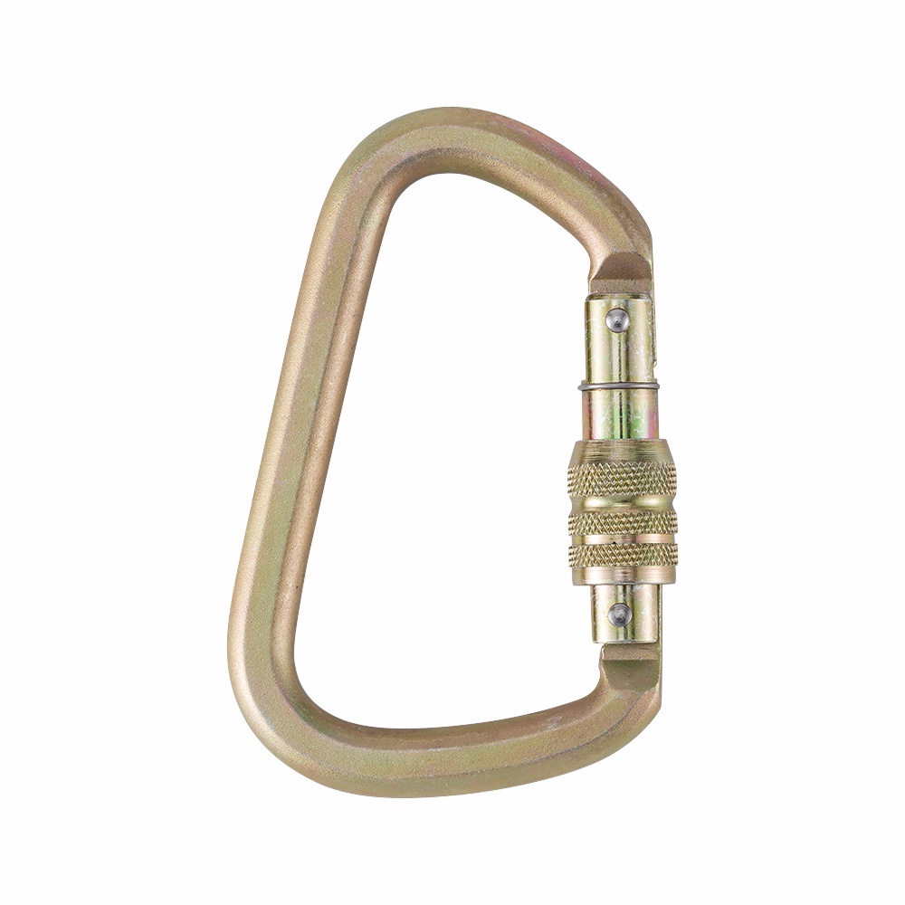 Mosquetón de acero de seguridad cierre en rosca de gran tamaño y gran apertura de puerta. Forma en D muy útil en varias aplicaciones de trabajo en altura y deportes de aventura.