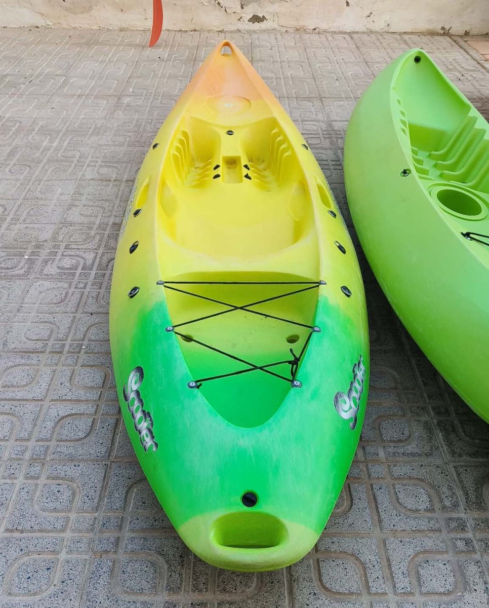 Kayak Simple Wave Sport, material de segunda mano rígido, dos asas de transporte laterales, una delantera y una trasera, compartimento porta objetos, pérdida de color en algunas zonas. Buen estado.