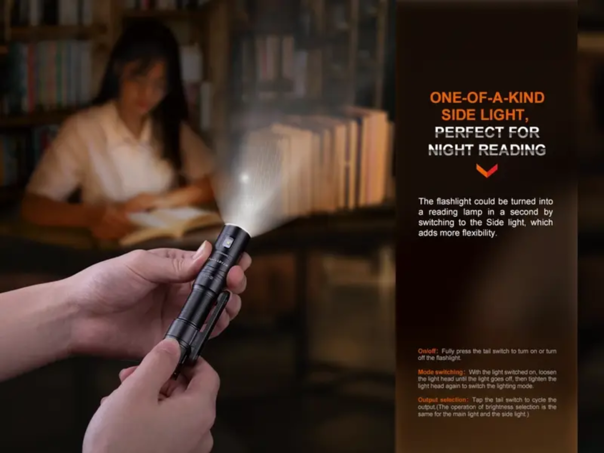 - Práctico diseño giratorio del cabezal de la linterna para elegir rápidamente entre la luz principal y la luz lateral.