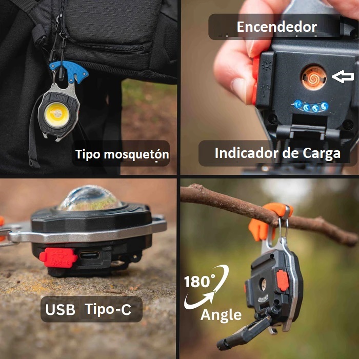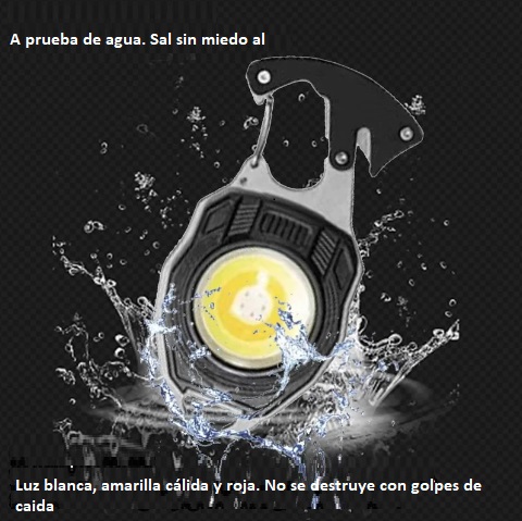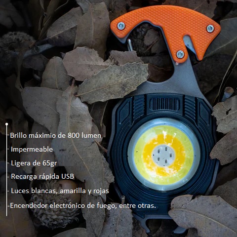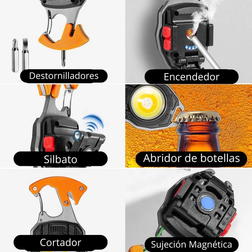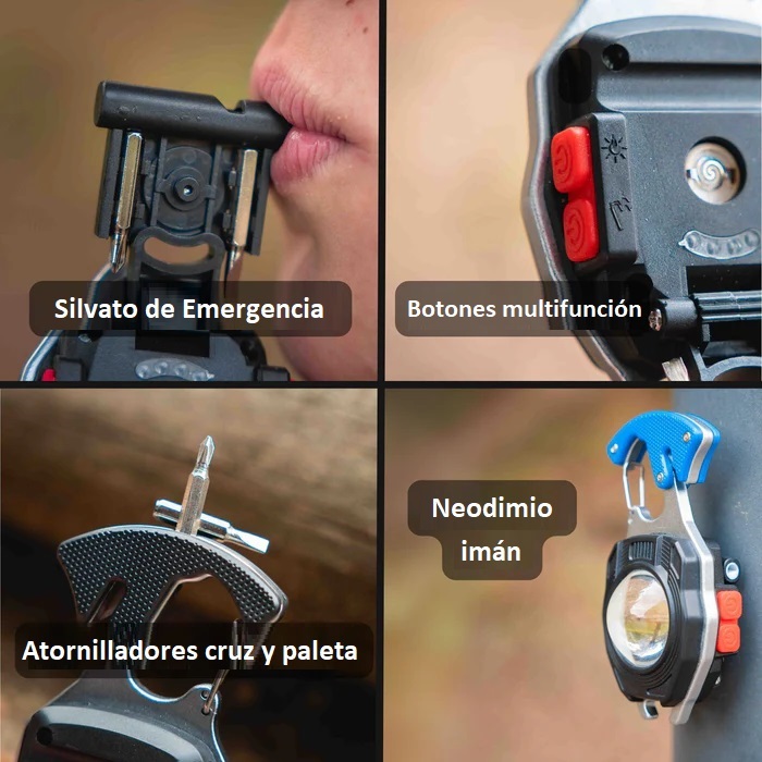 Equipada con 2 destornilladores paleta y cruz  + 1 silbato, abridor de botellas + cortador + encendedor,  La tecnología de fuente de luz recargable es lo suficientemente potente como para emitir luces de 800 lúmenes, y se puede utilizar durante aproximadamente 3 horas en su modo máximo. Si se cae al agua lo resiste, sigue funcionando y no se oxida. Si se cae o golpea no se rompe. Hecho de material de aleación de aluminio de alta calidad.  Está equipada con una base estable de fuerte atracción magnética de neodimio  que se puede fijar fácilmente a cualquier superficie de metal y una base giratorio que le permite trabajar con manos libres de larga duración. Puede proporcionar 7 modos de luz para satisfacer sus diferentes necesidades. Con una y hebilla tipo mosquetón y se fija fácilmente a una mochila, carpa o trabajos mecánicos. También se puede utilizar como un abrebotellas.