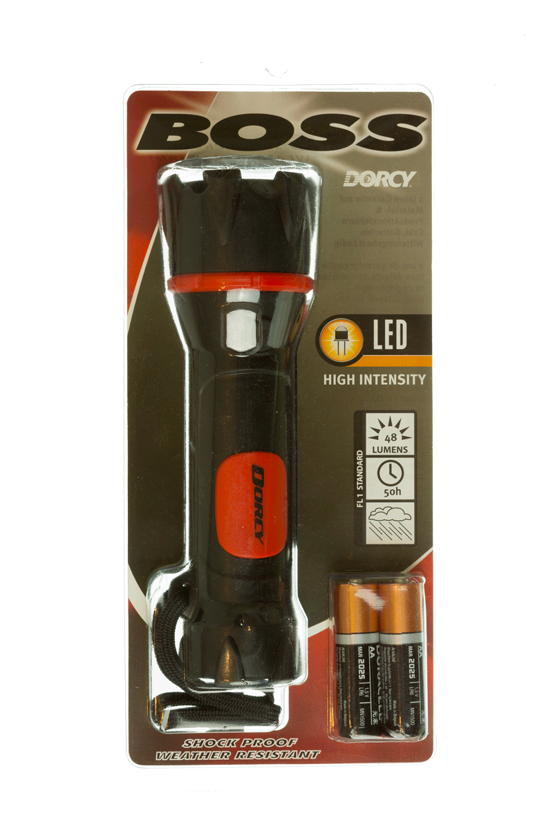 La linterna Dorcy de 48 lumens tiene un LED de alta intensidad. Funciona con dos pilas tipo AA.