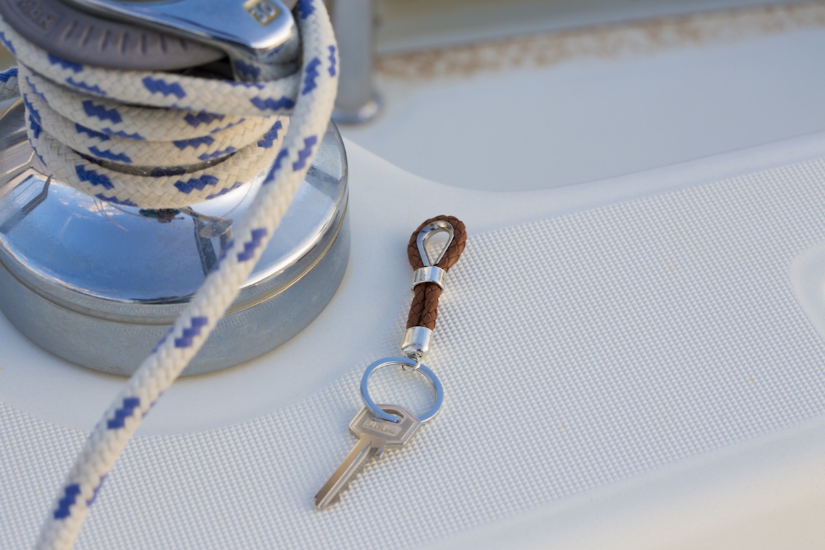 Llavero marinero hecho artesanalmente con cuero trenzado italiano y guardacabos de acero inoxidable.