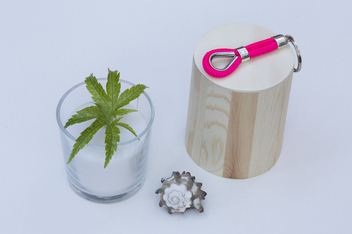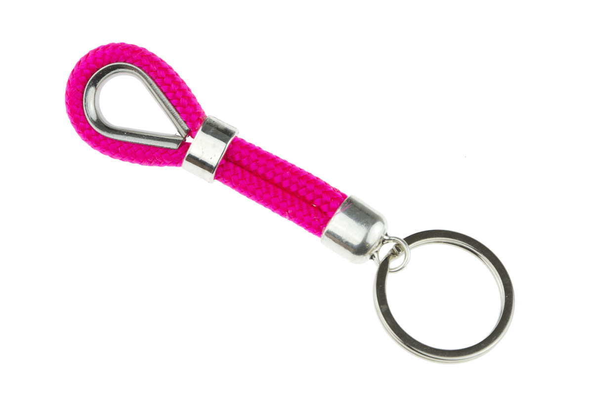 Llavero marinero en color rosa hecho con cabo marinero y guardacabos de acero inoxidable.
