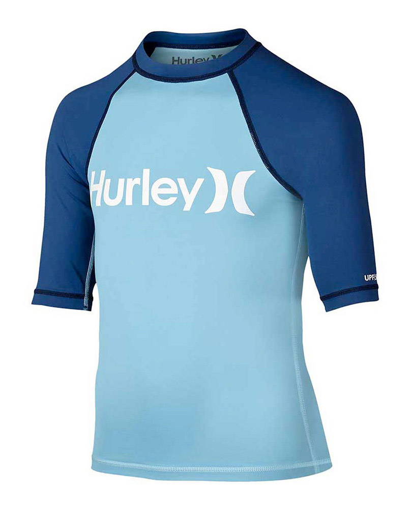 Lycra Hurley Surf One & Only Junior (varios colores), manga corta, bicolor, corte anatómico, cuello redondo ligeramente alto, protección solar UPF 50+, tratamiento antibacteriano, secado rápido, tecnología Stretch 4 sens y Flatlock para facilitar una mayor libertad de movimiento, tejido de poliéster extra flexible costuras planas para evitar los roces. Ideal para el surf con temperaturas medias.