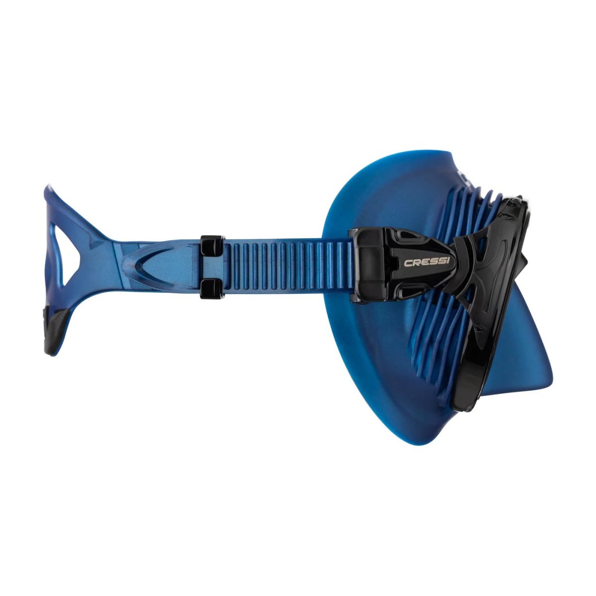 Hebillas completamente pivotantes en todos los sentidos y unidas a la montura mediante un elastómero flexible e irrompible. La tensión de la tira actúa directamente sobre la montura, manteniendo la estabilidad de la máscara y acercando al máximo el cristal a los ojos. El anclaje del sistema de hebillas en la montura evita la deformación del facial de silicona durante el uso de la máscara (propio de los modelos que anclan las hebillas en el propio facial) y la tensión de la tira se produce alineada al plano del cristal, optimizando a gusto del usuario el nivel de proximidad del cristal/ojo y, por lo tanto, el volumen y la visibilidad óptima de la máscara.