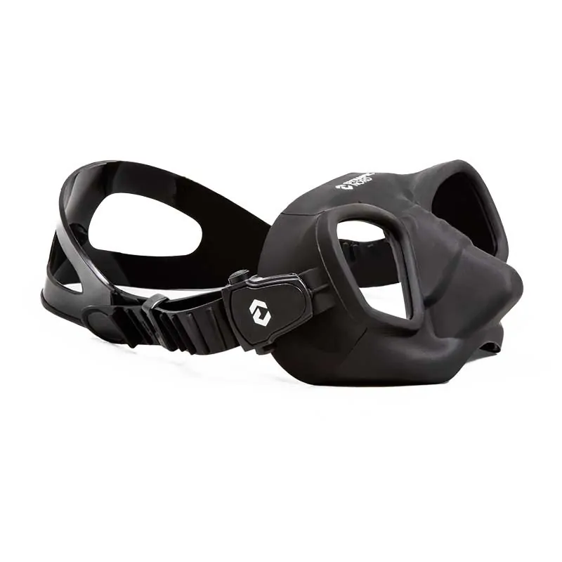 Máscara de apnea de volumen de aire interno muy reducido. Lentes de cristal templado. Nariz anatómica reforzada. Faldón y correa de silicona