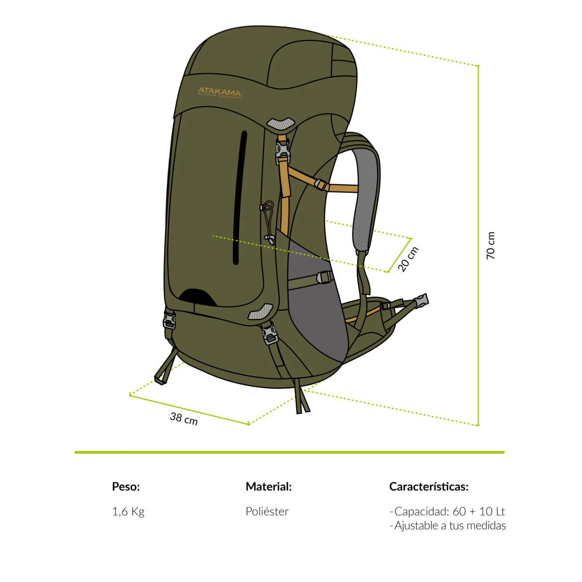 - Espalda ajustable por sistema de tallas y hombreras con dos opciones de ajuste.
