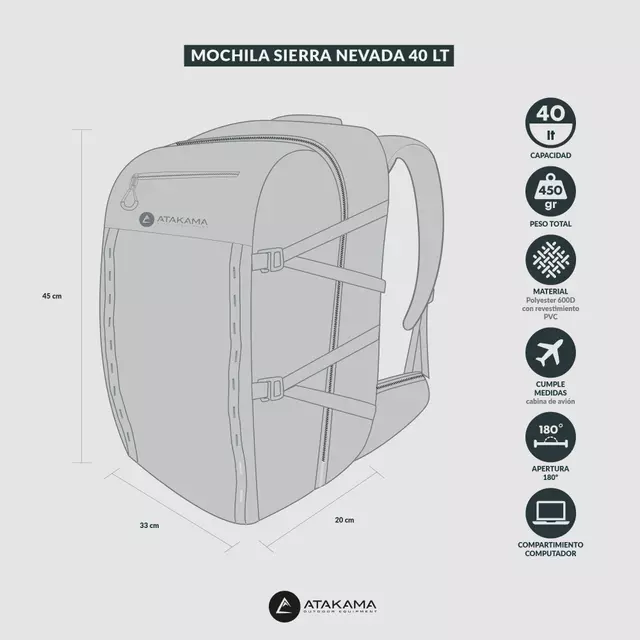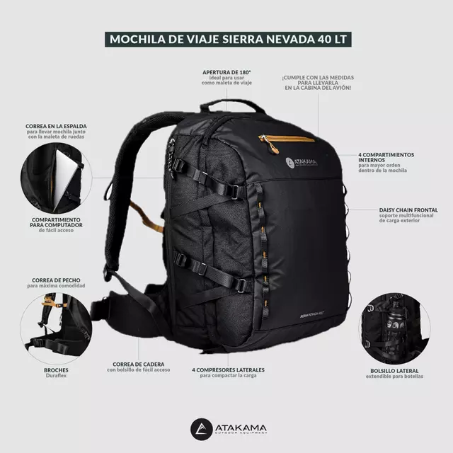 CARACTERISTICAS DEL PRODUCTO: Mochila de Viaje Atakama Sierra Nevada Negra 40 LT