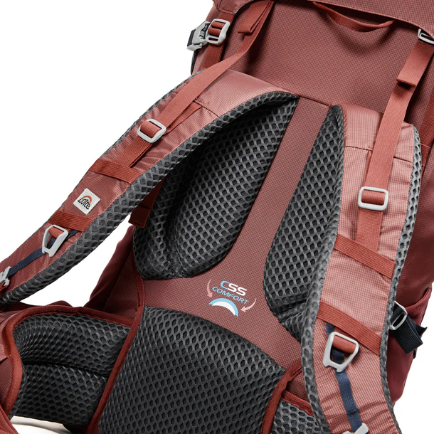 Incorpora el CSS System, un sistema de espalda acolchado estratégicamente en las zonas de mayor presión, que mejora el confort y el ajuste al cuerpo. Sus tirantes en forma de S, junto al cinturón lumbar desmontable y el cinturón pectoral ajustable, aseguran una distribución óptima del peso y mayor estabilidad durante la marcha.