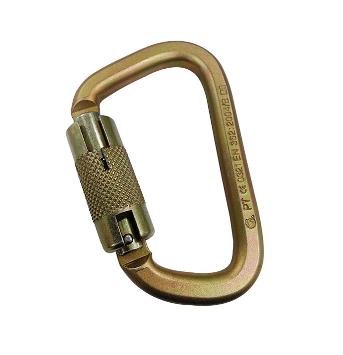 Mosquetón certificado de cierre automático de triple acción de alta resistencia fabricado en acero, se utiliza para realizar conexiones cortas con otros dispositivos, cuerdas y elementos que hacen parte del sistema de protección contra caídas.