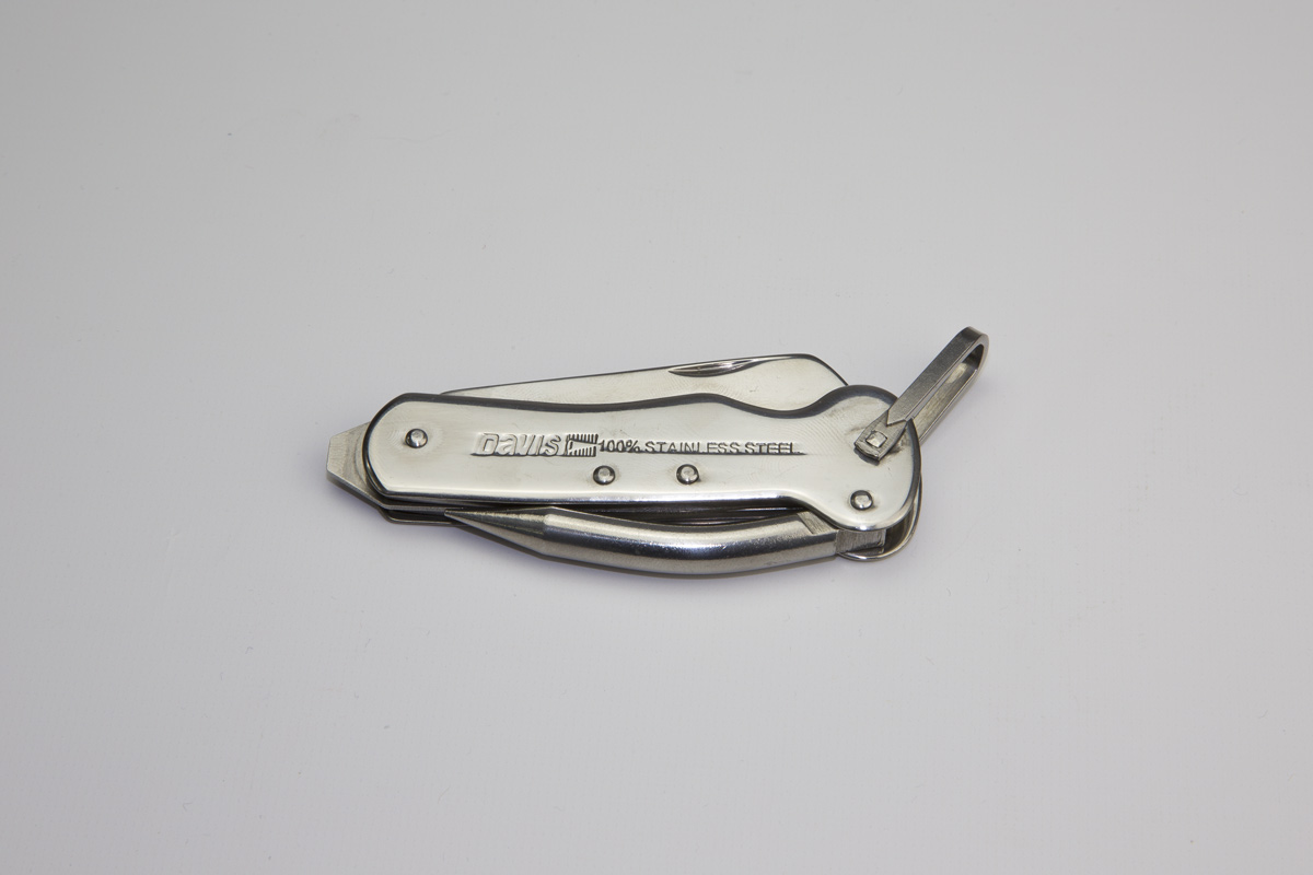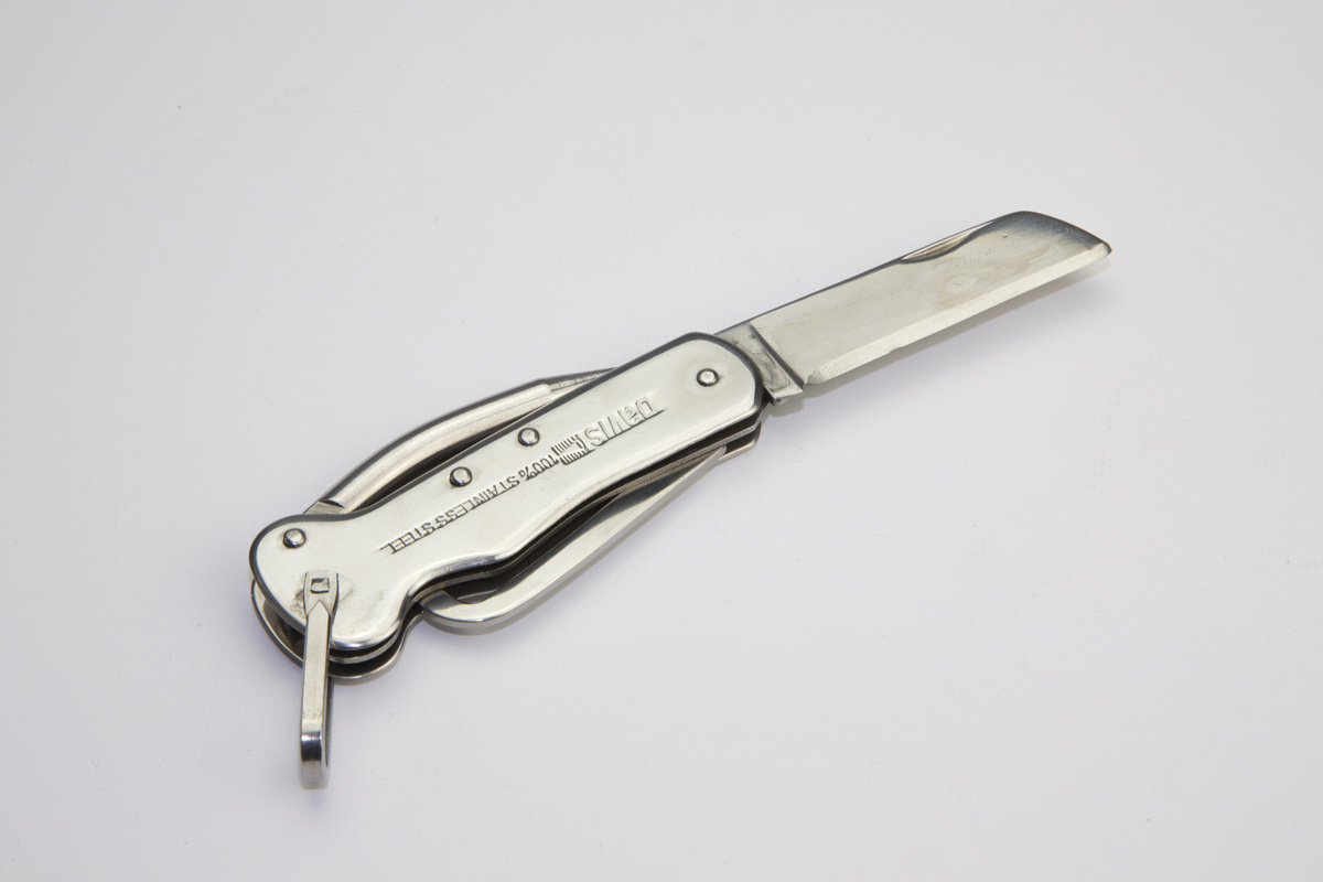 Tiene punzón para deshacer nudos, abre grilletes y destornillador.
