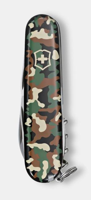 Hoja grande / Hoja pequeña / Sacacorchos / Punzón, escariador y aguja de coser / Anilla / Pinzas / Palillo de dientes / Abrelatas / Destapador / Destornillador 3 mm / Destornillador 6 mm / Pela cables