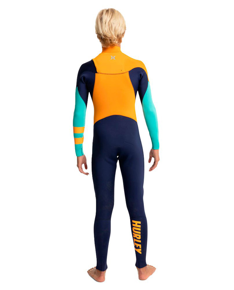 Neopreno Hurley Advant 4/3 mm junior, fabricado con materiales reciclados a base de carbón y piedra caliza, tecnología exterior Superstrech Neospan para mayor libertad de movimiento, interior Xtend 2.0, espalda y piernas delanteras con forro térmico de jacquard ondulado para mantenerte abrigado, cuello Smoothskin especialmente diseñado para minimizar la entrada de agua,