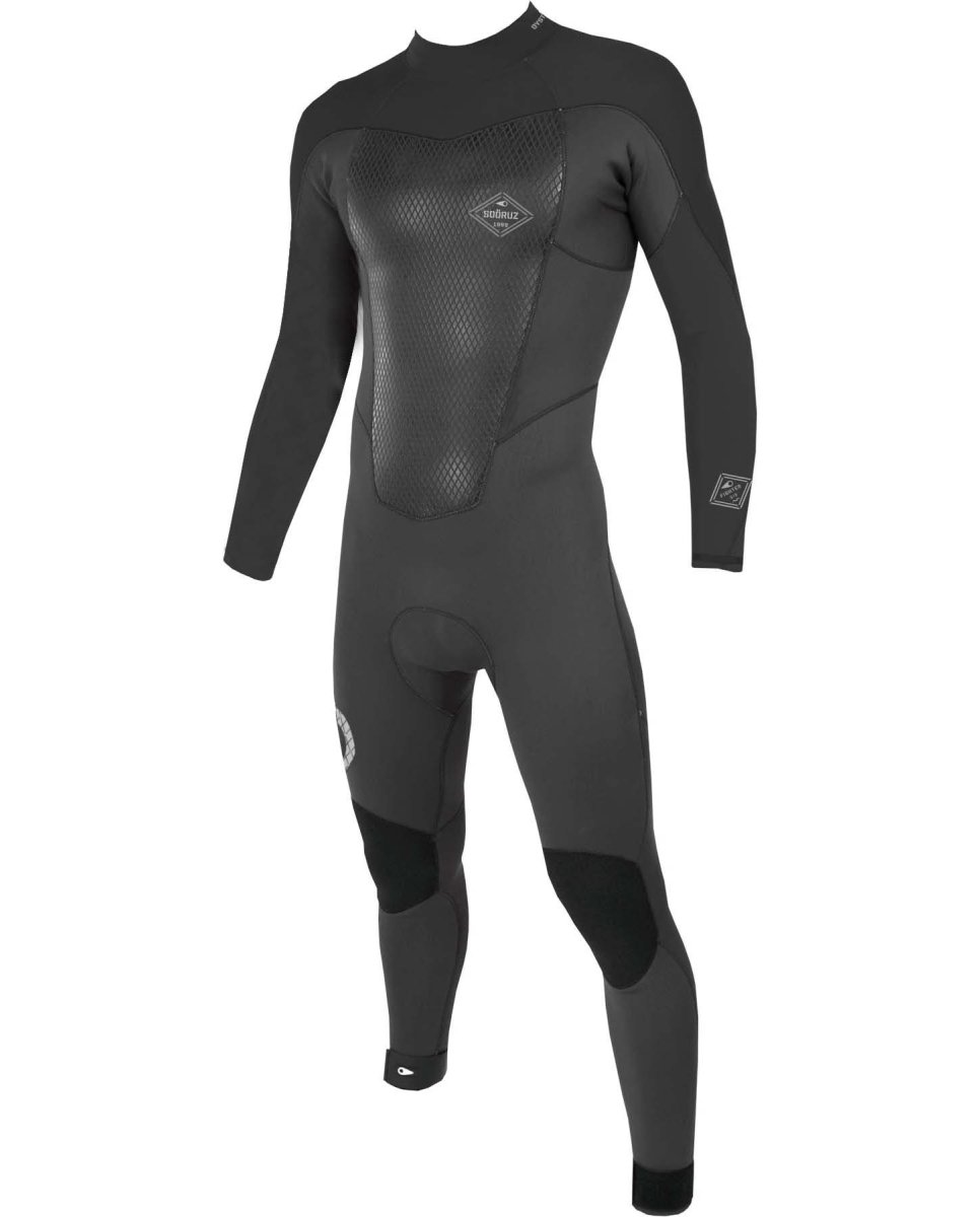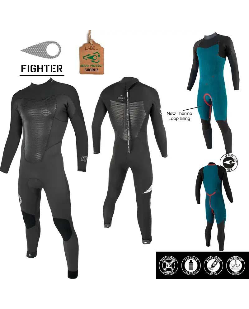 Neopreno Soöruz Fighter Oysterprene 4/3, fabricado en neopreno de piedra caliza G4 y G3-flex, costuras pegadas y reforzadas con parches en las uniones, forro interior Storm-dry de secado rápido en pecho y espalda, cierre trasero con cremallera y tirador.