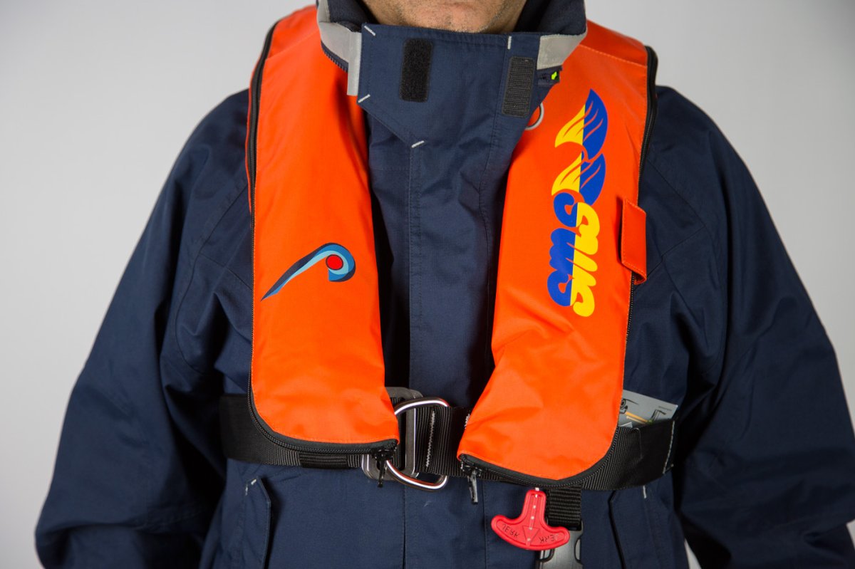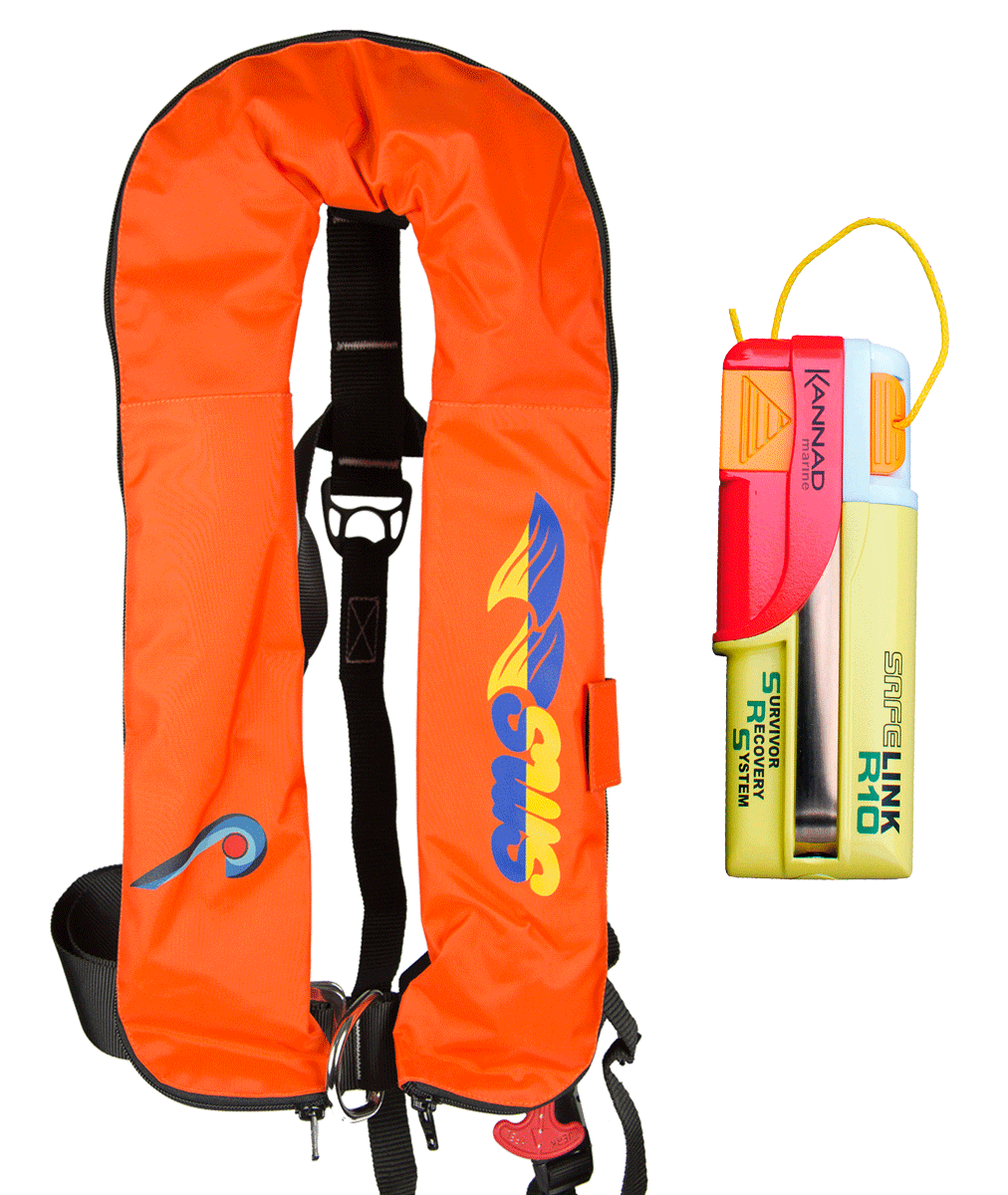 Pack de seguridad compuesto por un chaleco salvavidas de 150 newton profesional con arnés de seguridad y disparador Halkey Robers más la radiobaliza personal Kannad R-10.