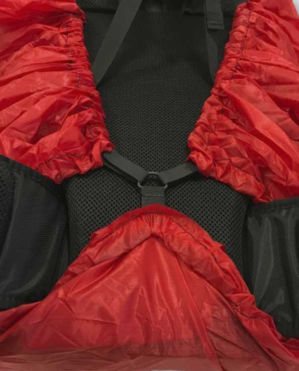 Su diseño es muy simple. Tiene un cordón que se ajusta firmemente alrededor de la mochila. Tambien encontrarás un clip para sujetarlo a las correas de los hombros.