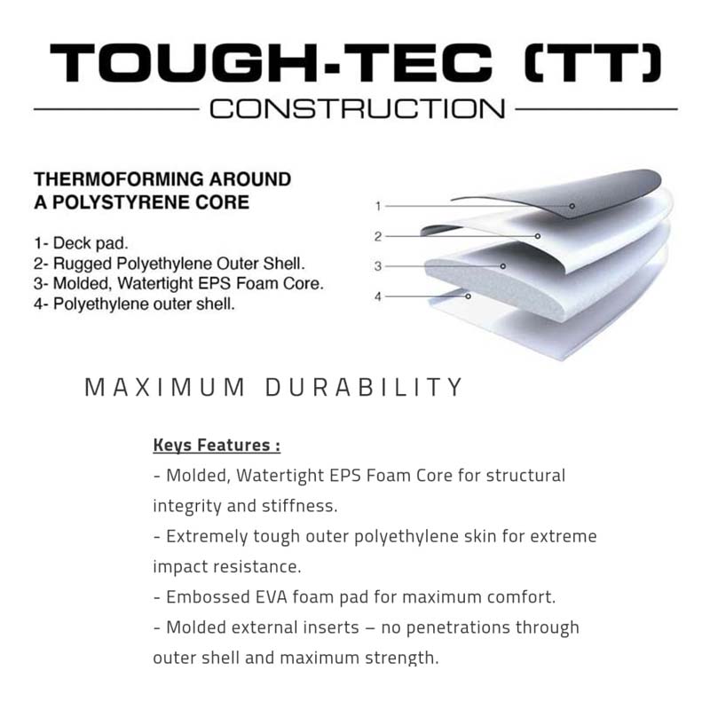 Las tablas con tecnología Tough Tec son de las más tablas de principiantes más fuertes y con mejor desempeño del mercado. Con un recubrimiento de polietileno y un centro de foam de alta densidad similar al utilizado en tablas convencionales. Tough Tec ofrece durabilidad con el rendimiento y la autentica sensación de una tabla mucho más frágil y de mayor precio.